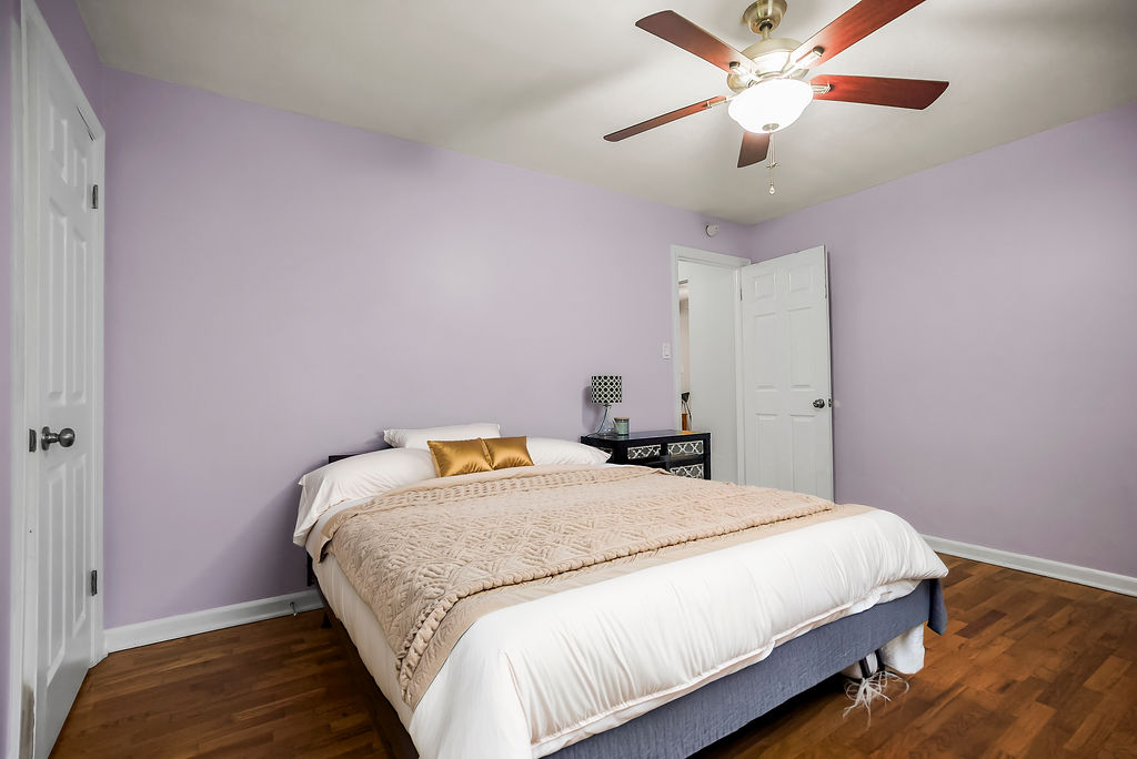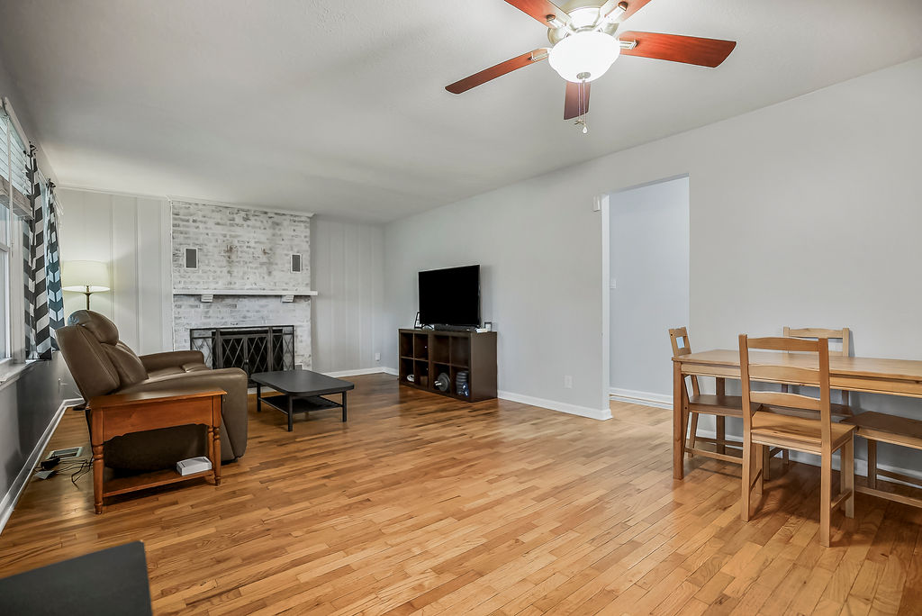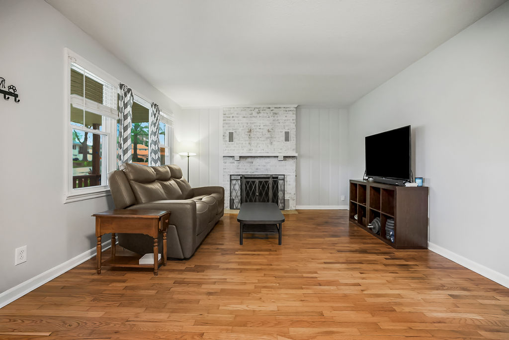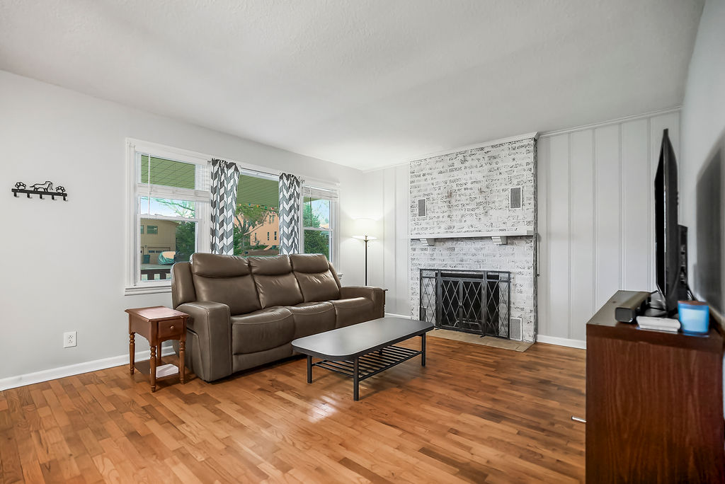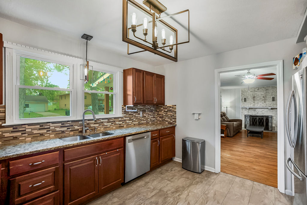 Inside, a beautiful stone fireplace takes center stage in the open living and dining area, creating a warm and inviting space that instantly feels like home. Three bedrooms with hardwood floors and a beautifully remodeled full bathroom anchor one side of the home. On the other side, a generous laundry and mudroom leads into the oversized fourth bedroom — privately situated with its own full bathroom and brand new carpet, making it an ideal guest suite, home office, or primary retreat. The remodeled kitchen impresses with granite countertops, a gas stove, and abundant cabinetry — everything a home cook needs without sacrificing style.